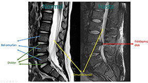 Yukardaki şekilde normal (solda) ile bel fıtığı olan bir hastanın (sağda) omurgalarının manyetik rezonans incelemeleri karşılaştırılmıştır. Filmleri incelerken yandan baktığımızı aklınızda tutun. Buna göre sağ taraftaki hastanın 3. ve 4. bel omurları arasındaki diskin bir parçasının yerinden çıkarak omurilik kanalına doğru yer değiştirdiğini ve bu bölgedeki sinirlere baskı yaptığını görebilirsiniz.