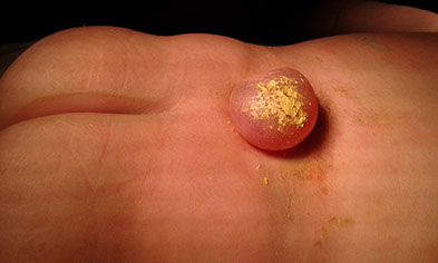 Lipomyelomeningosel; sırtta orta hattı içine alan bir yağ bezesi şeklindedir. Ancak bu yağ dokusu omurilikle ilişkilidir ve radyolojik incelemeler yapılması ve sonrasında opere edilmesi gereklidir.
